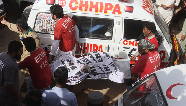 KARACHI, PAKISTAN – MAY 22: Rescue workers move a body from the