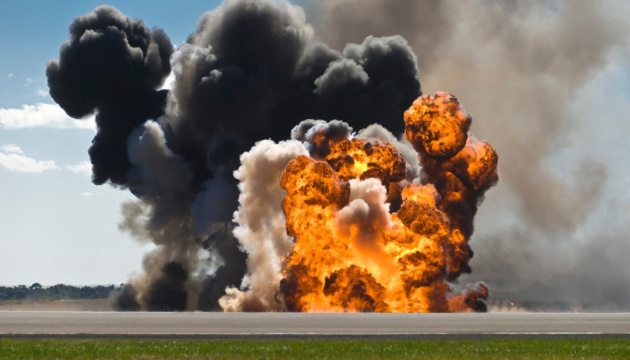 Fiery explosion with thick black smoke on an airport runway.