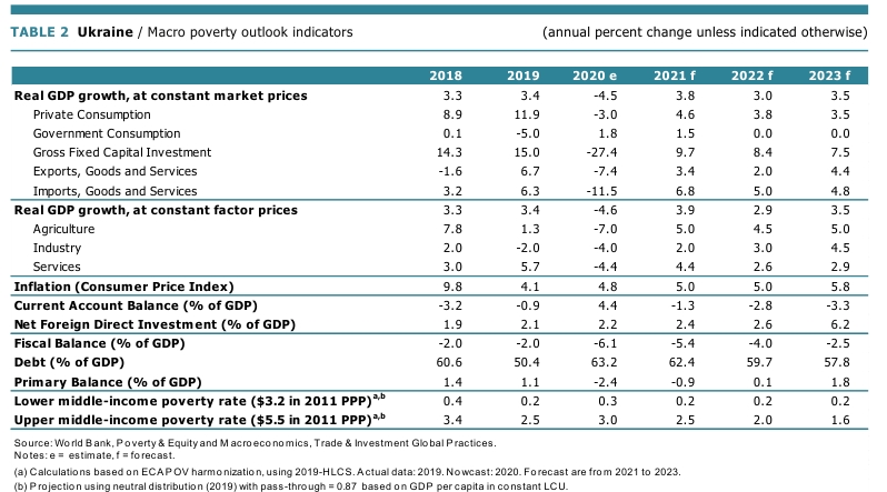 Світовий банк поліпшив прогноз зростання ВВП України у 2021 році до 3,8% (у січні СБ чекав зростання на 3,0%). За оцінкою СБ, у 2020 році економіка України скоротилася на 4,2% (раніше банк очікував падіння на 5,0%). При цьому Світовий банк погіршив прогноз зростання економіки України у 2022 році на 0,1 в.п. до 3,0%.
